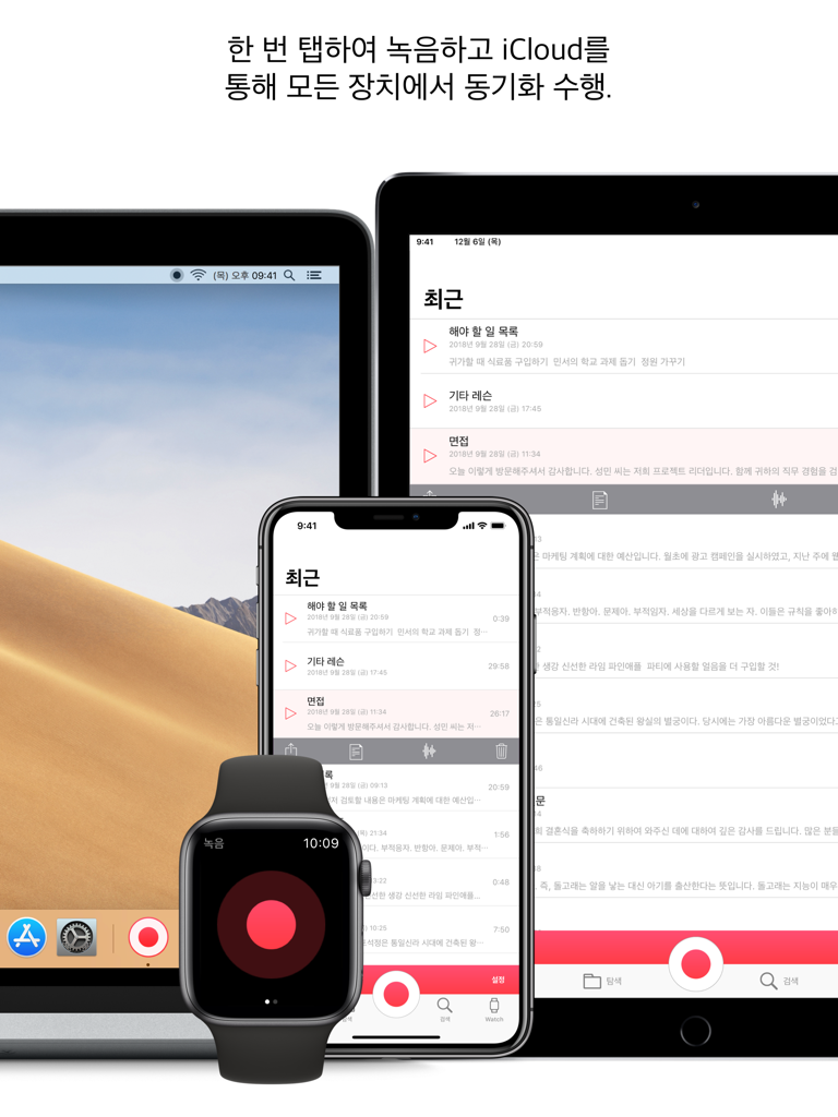 • iCloud Drive에 저장된 녹음 내용은 모든 장치에서 자동으로 동기화.